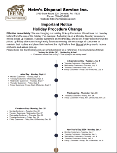 To better serve our customers we will be changing our Holiday Procedure We are changing our Holiday Pick-up Procedure effective immediately. We will now run